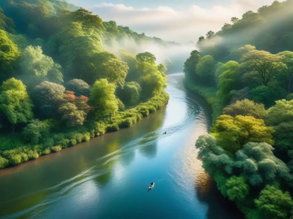 Un río majestuoso serpenteando entre exuberantes bosques, con luz solar filtrándose entre el dosel y creando sombras en el agua