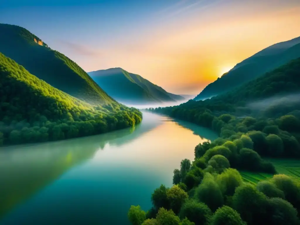 Exploración del río Lena en Siberia: amanecer sobre las aguas serpenteantes, bosques verdes, niebla y colores vibrantes